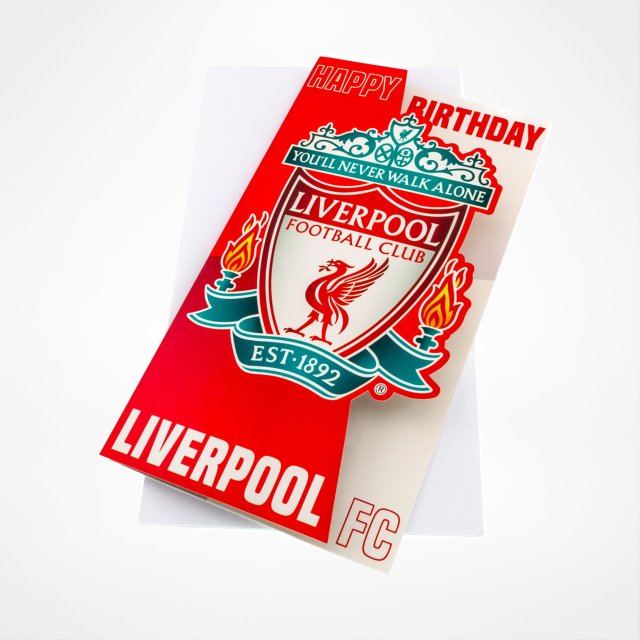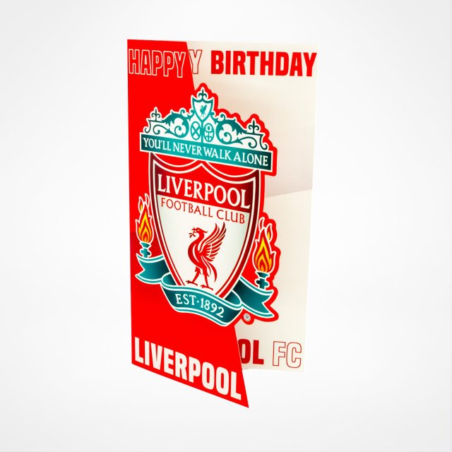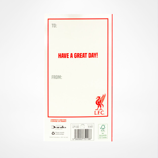 Färgglatt födelsedagskort med glansig finish och ett stort LFC-emblem på framsidan och Grattis på födelsedagen överst. Medföljer ett vanligt vitt kuvert. Kortet är ca 22 cm x 12 cm.